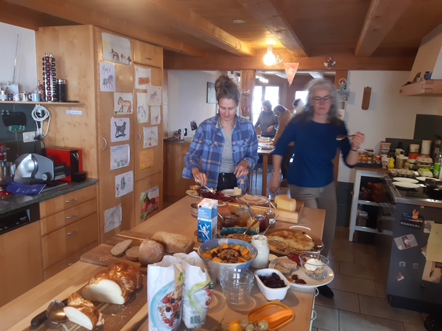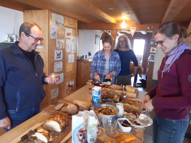 Kalt und bewölkt war es, als wir uns in Oberbalm bei Ramsers trafen. So war es umso gemütlicher, im kleinen liebevoll dekorierten Speicher zusammen zu rücken. Das Ambiente passte auch gut zum Motto der diesjährigen Hauptversammlung unserer Regionalgruppe. Nach langer Zeit, in der wir uns wegen Corona nur per Zoom gesehen hatten, sollte es dieses Jahr vorallem um das Zusammensitzen, Plaudern und Austauschen gehen. Statt einer kopflastigen Weiterbildung wurde das leibliche Wohl in den Mittelpunkt gestellt. Ramsers Brunch war vielseitig, bodenständig und reichlich. Dazu herzlich serviert, Melanie Ramseier nahm sich die Zeit uns ihren Hof vorzustellen und ihren Hofladen schmackhaft zu machen. Applaus erntete sie besonders für den letzten Auftritt in ihrer Tracht.